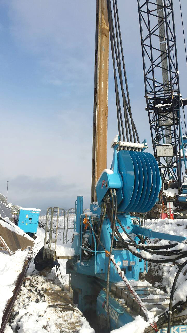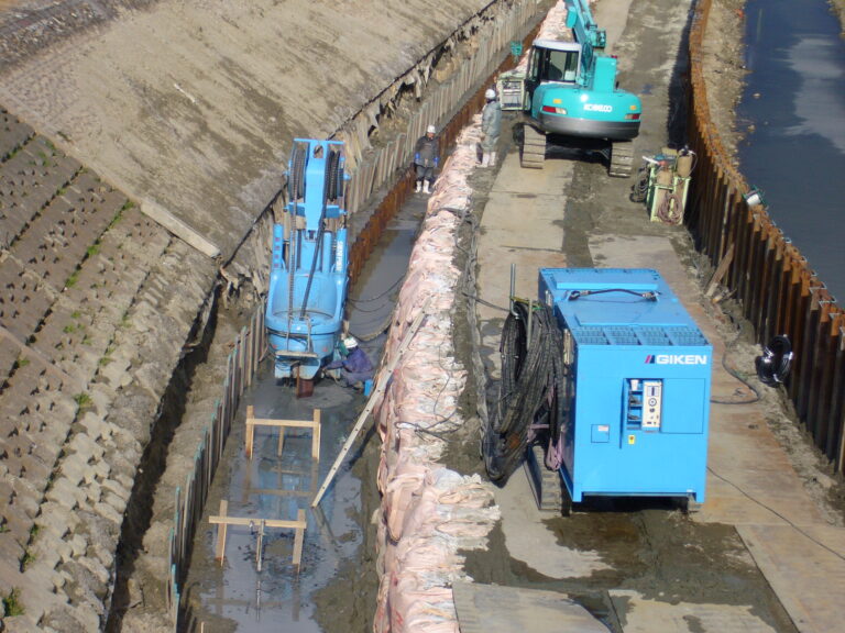 杭材の両端2箇所に圧入力点(圧入力を加える力)を設けることで、圧入パワーを確実に伝達。3枚の反力杭の継手部を挟んだ状態で掴み一体化させることで、より安定した強い反力基盤を構築。